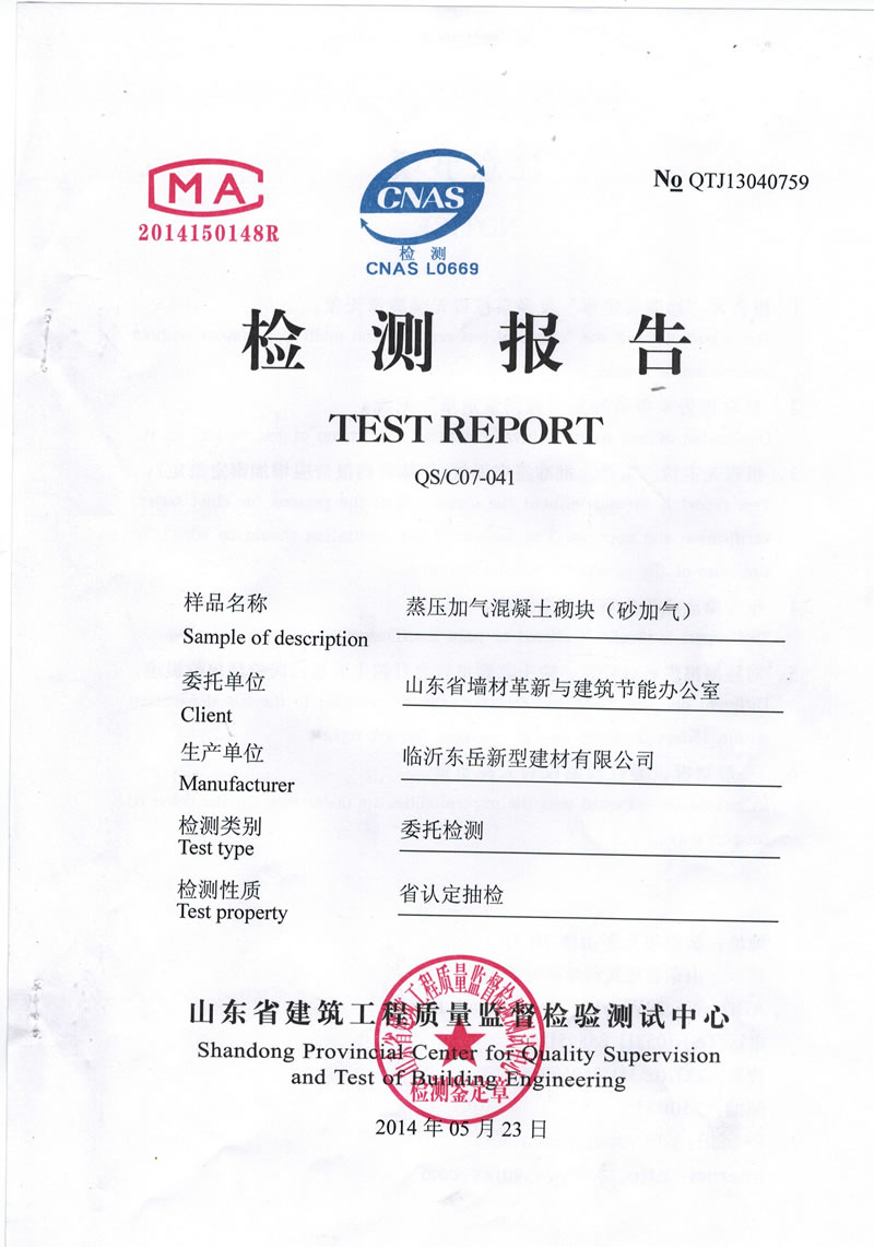 蒸壓加氣混凝土砌塊(砂加氣)檢測報告